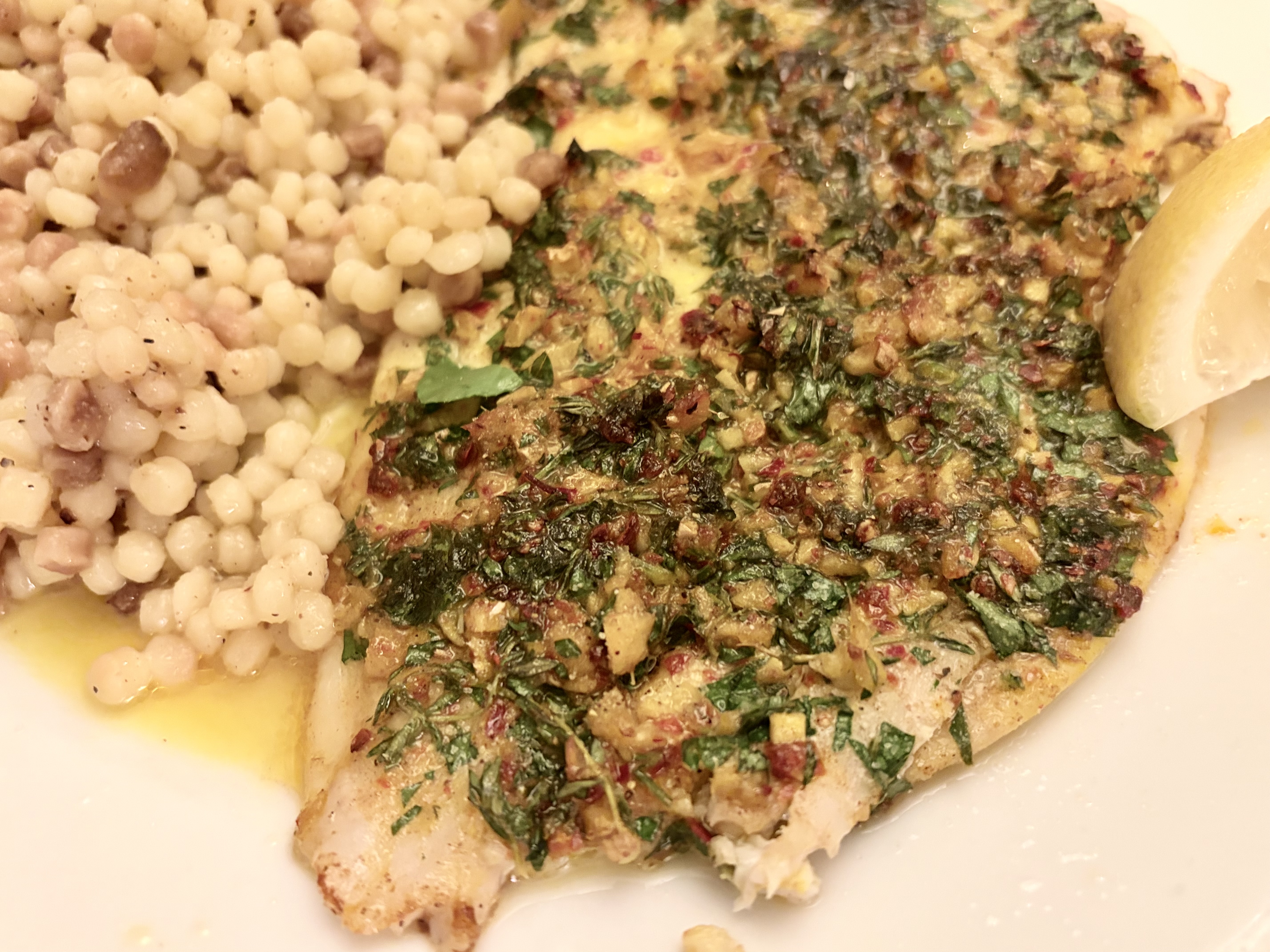 I’ve added a caramel orange dessert that I’ve been making for many years. This time I included cardamom instead of cinnamon and orange flower water, just because it seemed to be the thing to do. I wanted fruit, but there are no spring berries popping up yet in New York, and we’ve still got oranges. I thought this would be a good follow-up to the lemon sole, which I served with Israeli couscous seasoned with butter and a pinch of cinnamon.