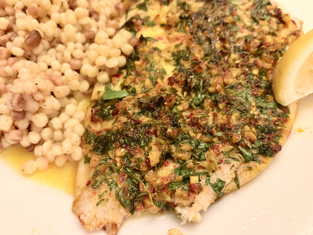I’ve been to Morocco only once so far, but I have a lot of Moroccan cookbooks, and they’ve taken me on a journey through tagines, couscous, Marrakesh street food, and unfamiliar spices and spice mixes. Being a lover of most things seafood, I’ve been attracted to a Moroccan preparation called chermoula, a paste of fresh herbs and spices that’s mainly smeared on fish before cooking. Some cooks add hot chilies, others sharp spices like cumin or gentler spices such as cinnamon and saffron, but one constant is cilantro, in abundance. If you’ve been reading my posts for any time, you know that I abhor cilantro. Even the smell of it makes me gag. It’s extremely popular in Moroccan cooking, but I’ve worked my way around it by substituting parsley or mint or oregano, and sometimes a mix of all three. This chermoula preparation is usually so cilantro-heavy that I didn’t know how I could pull it off and still call it chermoula. So I never tried making it until now, when I finally decided not to worry and just say screw it, I’ll make it my way and call it my chermoula. So here’s what I came up with. Not traditional but, I think, really delicious. The recipe I’m offering you here is a simple treatment. All I’ve done is coat a nice piece of lemon sole bottom and top with my chermoula and stuck it under a broiler. Sole is so thin that the broiler works perfectly, cooking it to tenderness with a little browning at the edges in about 5 minutes. Other thin fillets that would work well this way would include gray sole, flounder, and fluke. But the paste will also great on shrimp kebabs or tuna or swordfish (you might want to try a grill for those), or eggplant, or even on chicken thighs, which did great in a hot oven. I hope you’ll like my American-Italianized version of chermoula.