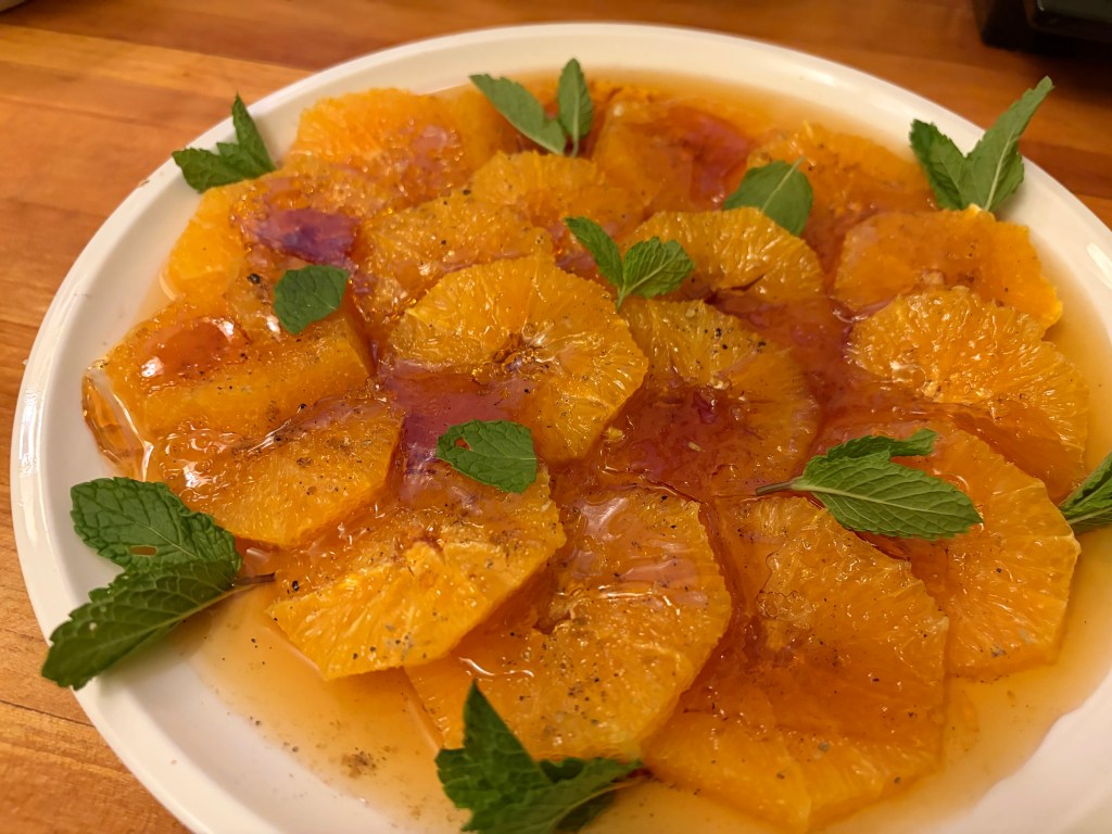 Pour sugar into a saucepan (I used about ¾ cup, but adjust depending on how many oranges you’ve got). Add a drizzle of water. Cook over medium heat until the sugar turns a rich golden brown (you’ll really need to watch it, as once it starts to go golden it can turn from beautiful caramel to smoking black in an instant). Drizzle the caramel more or less evenly over the oranges. The caramel will harden, becoming candy-like. Let sit unrefrigerated for about about 2 hours. The caramel will soften as it mingles with the juice from the oranges, forming a nice caramel sauce. Garnish with mint or basil, if you like.