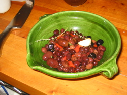 I’ve decided to open the meal with black olives flavored with hot chilies, and almonds flavored with rosemary and a little sugar; little bites, good with a glass of dry rosé wine, I’m thinking. After that there will be turkey stuffed with garlic, rosemary, and lemons, and lots of vegetables, probably including something with a touch of bitterness such as broccoli rabe seasoned with more garlic and a sprinkling of fennel seeds and chili flakes, or baked fennel topped with a good grating cheese (Parmigiano or a mild Pecorino), or carrots sautéed with capers, which I love with turkey.