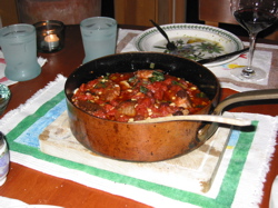 When I’ve had it with starch-and-olive variations, I turn to my long list of seafood-and-olive variations, a time-honored pairing if there ever was one. This week I played around with a dish my family sometimes serves as part of our Christmas Eve fish dinner, a braised cod, either fresh or dried, with tomatoes, black olives, Marsala, and mint, a real Sicilian mix of flavors. Tuna is wonderful when slowly braised, so I substituted it for the cod and it worked out nicely, and I think it’s a nice change from the semi-raw tuna I’m almost always served in restaurants. If you’re looking for something new for your Christmas Eve fish extravaganza, you might want to include this. I recently served it with couscous flavored with pistachios, a pinch of cinnamon, and a little more fresh mint, just to keep the theme going.