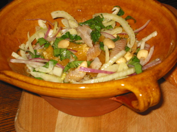 When I first read this intriguing but vague request from one of my readers, I immediately thought of a hot dish of mackerel roasted with fennel and orange zest and then garnished with toasted almonds. Delicious. But then I remembered that this flavor combo was familiar to me in another incarnation. About eight years ago, on my first trip to Sicily, I ate dinner at a place in Palermo that specialized in traditional Sicilian dishes (most places in Palermo specialize in traditional Sicilian dishes, but this one seemed to do so in an especially antiquated and formal way). I unfortunately can’t remember the name of the place, but I recall an interesting dessert, a watermelon gelatina, poured into a pastry shell and decorated with fresh jasmine blossoms. The gelatin itself was flavored with cinnamon and rosewater, and dusted with cocoa, a strange but delicious combination with obvious Arab lineage. Another dish I ate that evening was an antipasto, a salad of smoked fish, which may have been sardines, herring, or mackerel-something strong-with orange slices and toasted almonds. The taste was startling, in a not altogether good way. Something about the fish and orange mingled to produce the aroma of low tide. But I thought about that dish when I got home and somehow felt the combination had potential.