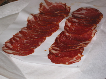 Now to address the main issue here, the pasta. The problem with pasta, as I see it, is the way it’s digested quickly, turning into sugar and getting inconveniently stored as blubber on my butt and thighs. I hate that, but I’ll be damned if I’ll give up pasta. Whole-grain pasta digests more slowly than the refined white flour kind, making it better for regulating blood sugar and fat metabolism. But I have to admit, whole-grain pastas used to really turn me off, tasting of the musty health food store. But I’ve been sampling a lot of them lately, and I’ve found really good ones with good texture and beautiful nutty flavor. Latini, maybe my all-time favorite pasta maker, turns out amazing farro and single-grain pasta that can be purchased through http://www.gustiamo.com, a great Italian food website. Martelli produces a wheat-germ pasta that I really love. As I write, it’s out of stock at Gustiamo, but I’m hoping they’ll get a new shipment in soon. Buonitalia.com carries Monterosso whole wheat pasta, a very good brand with good texture. Another excellent farro pasta, one with a pronounced wheat taste, is made by Giacomo Santoleri in Abruzzo. I buy it at Italian grocery stores in New York, but it’s also available through http://www.agferrari.com. (One whole wheat brand I’m not crazy about is Barilla, which always cooks up slightly crumbly.) These nutty, robust pastas taste best paired with a bold sauce like the capacolla-based one I’ve chosen here (they’re also excellent with anchovies, as you’ll discover in an upcoming Skinny Guinea post).
