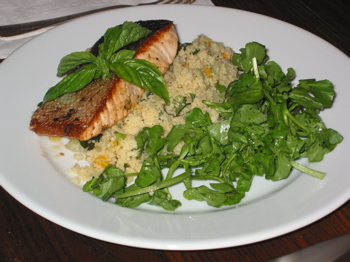 I’ve reached into my bag of Sicilian flavors to season up my sear-roasted salmon here, choosing fennel and orange and a hit of basil for a good transitional dish, a sort of segue into spring before spring produce is actually available. And in my continuing quest to rid my life of refined carbohydrates, I’ve gone with whole wheat couscous as an accompaniment. It’s actually really delicious. It doesn’t taste health-foody at all.