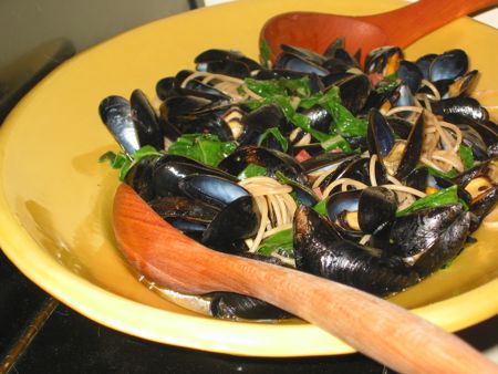 Mussels with Whole Wheat Linguine, Swiss Chard, and Smoked Chili
