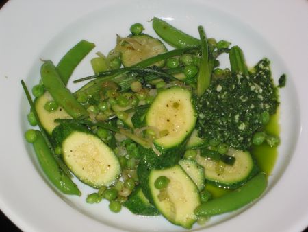 I like going to the market and simply selecting vegetables by color, and then coming up with a way to present them, all together, in a palate of visual and savory pleasure. This week I picked up snap peas, shell peas, little baby fennel, and first-of-the-season zucchini, all in varying shades of green that really caught my eye. And I grabbed basil, parsley, and tarragon because there they were there. I decided to do a little sauté of pretty green things and make a pesto of green to go with it. Now I had a plan.