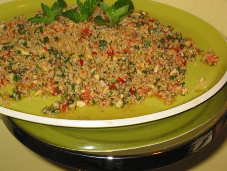 Maybe not so depressing when I think it through, though. Lately I’ve been trying to come up with delicious substitutes for my beloved summer potato salads. Whole grain is ideally what we should be aiming for, but I want my food to be pretty, not looking like a lump of brown mushy garbage, which is what whole grain dishes often resemble. I picked up a bag of bulgur at the musty health food store on my block. Bulgur is the cracked wheat used in many Middle Eastern dishes like tabbouleh. I like tabbouleh, but how could I make the stuff look appealing and, more important, taste Italian?