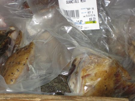 For starters they stock Setaro pasta from Naples (after Latini, my favorite), and they’re the only place I know that does. You can buy bright green pistachios di Bronte from Sicily, butter made with Parmigiano milk (amazingly rich), almond flour, chestnut flour, semolina flour, chickpea flour for making Sicilian panelle, Strega-filled chocolates, fish shaped-marzipan, orange-flower tea, Black Umbrian truffles, vincotto from Puglia, mostardo from Cremona, guanciale (the cured pork cheek indispensable for traditional pasta carbonara), bottarga di muggine (made from mullet roe), colatura di Alici (a pungent anchovy syrup from Campania), menaica anchovies, braised eel, porchetta, lardo flavored with rosemary, fresh Italian yeast, buffalo-milk ricotta from Naples and fresh stracciatella (both very fresh the three times I’ve bought them), Miscela d’Oro coffee, much cheaper than Illy and in my opinion every bit as good. They’ve got shrink-wrapped Italian dried beans galore with names such as verdolino, tuvalgiedda marrone, tabacchio, San Michele, panzaredda, nassieddu viola, ciuto, munachedda, and marucchedda. What the hell are all these beans? All that in addition to the expected olive oils, canned tomatoes, and vinegars.