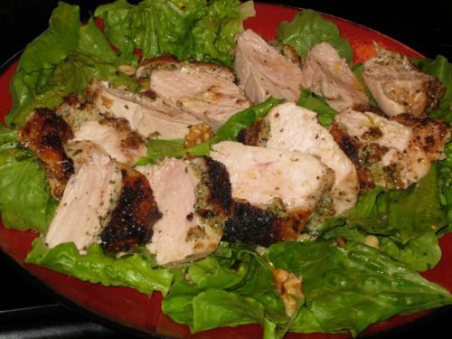 Broiled Chicken Breast with Walnuts, Garlic, and Parsley, Served on Bibb Lettuce