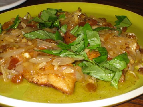 Now that I like catfish again, I’ve been looking for ways to make this native of the Southeastern United States taste Italian. What I’d been thinking is agro dolce, that sweet-sharp flavoring so popular in Southern Italy (think of caponata). Traditionally fish agro dolce is a marinated preparation, and it’s a very old one, devised to extend the seafood’s freshness. The agro dolce sauce is usually a simmered-down mix of onion, raisins, pine nuts, and vinegar, and sometimes wine or citrus juices or capers. This hot sweet-and-sour mix is poured over fried fish and left to soak in for several days. Depending on whether you’re going highbrow or lowbrow, you can use sardines or a fancy white fish such as sole. Either way, you end up with a very rich, soft fish to serve at room temperature. It’s delicious as an antipasto with a glass of Falanghina white wine.