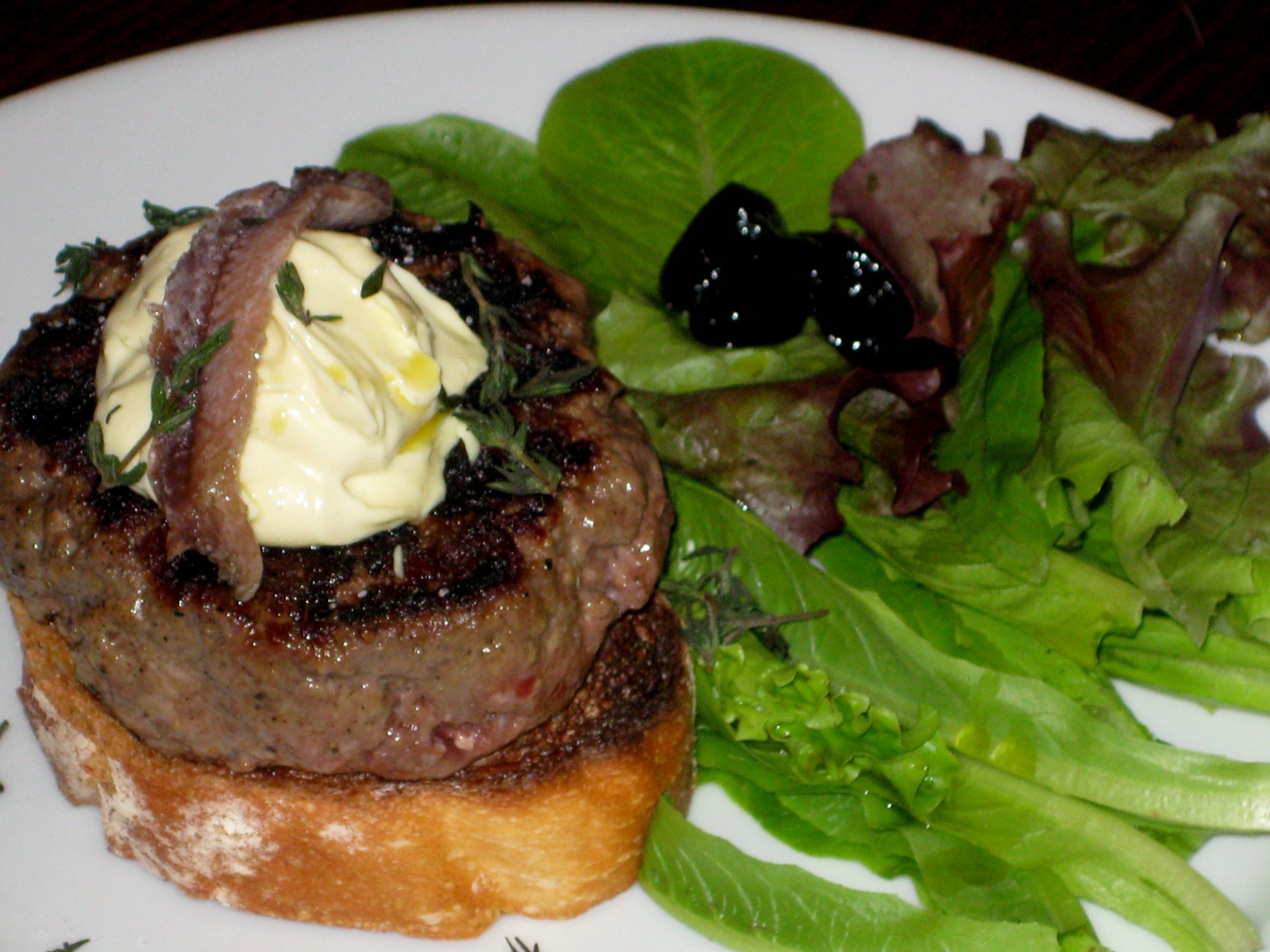 This sweet but powerful mayo is excellent on blanched asparagus, grilled eggplant, roasted peppers, grilled sardines, and lots of other things. Last night I tried it on a rare burger, and I have to tell you, that really makes a great combination. Resist the temptation to add cheese to your burger. The mayo stands alone. And it seemed somehow more appropriate to do an open burger, on a toasted piece of Italian bread brushed with olive oil—a knife and fork experience. I draped an anchovy over the mayo for an added kick.
