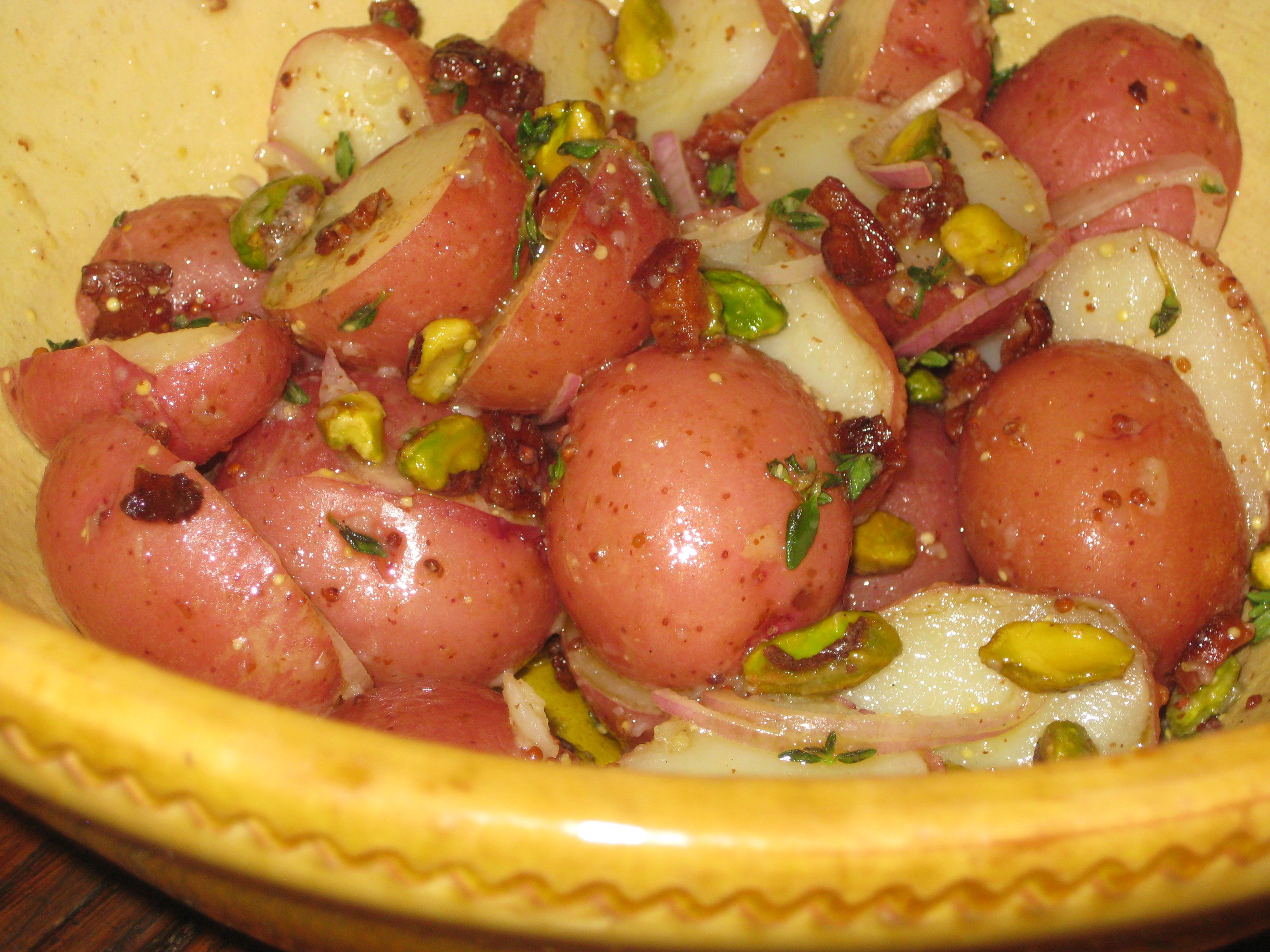 Improvvisata. In terms of Italian cooking, this can mean a number of things, from the highest creative impulse to just using up what you’ve got in your pantry to its best advantage. In the case of this potato salad, I mean the later. I had pistachios left over from my last blog, which featured a Sicilian nut pesto. Little red potatoes were sitting there in their mesh bag. And I ask you, what goyl can go a day without knowing she’s got a nice lump of pork fat in the frig, so I always have pancetta. I gathered a few stems of fresh herbs from the depths of my vegetable bin, considered the rosemary, scrapped it, and settled on thyme instead. A little mustard, some good olive oil. I had a lemon and a small shallot.