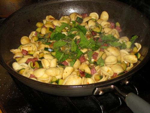 Orecchiette with Baby Zucchini, Saucisson a l’Ail, and Mint
