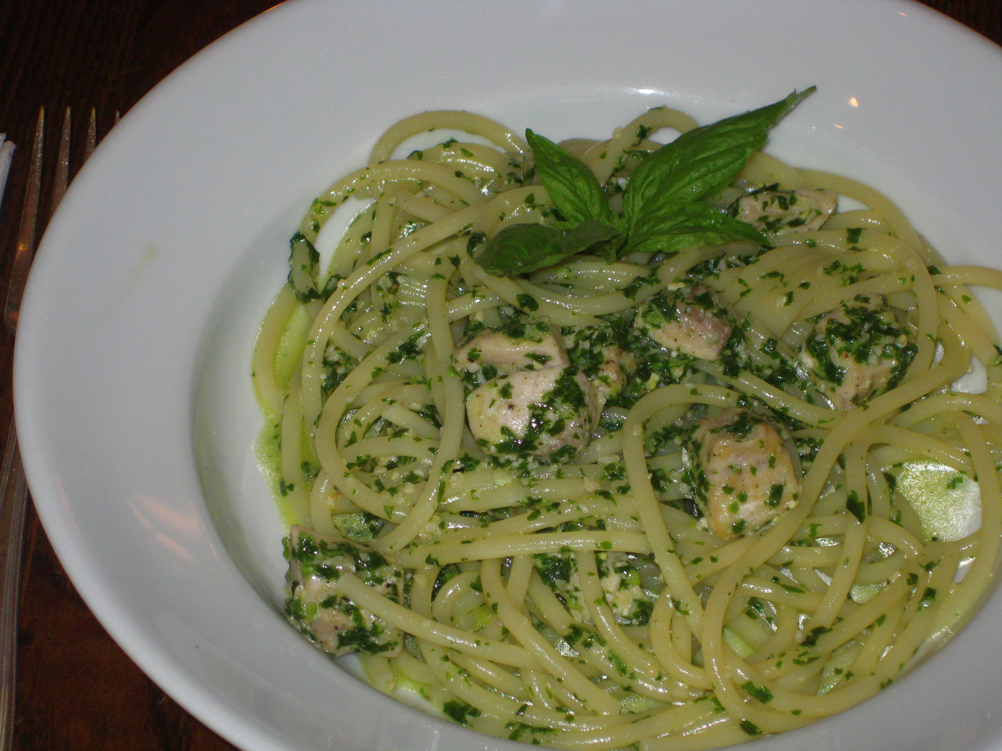 Bucatini with Swordfish and Basil Almond Pesto