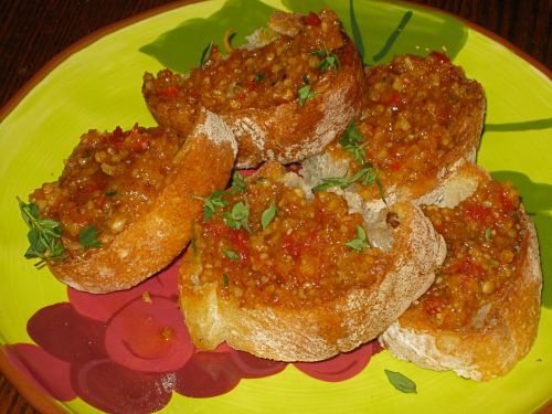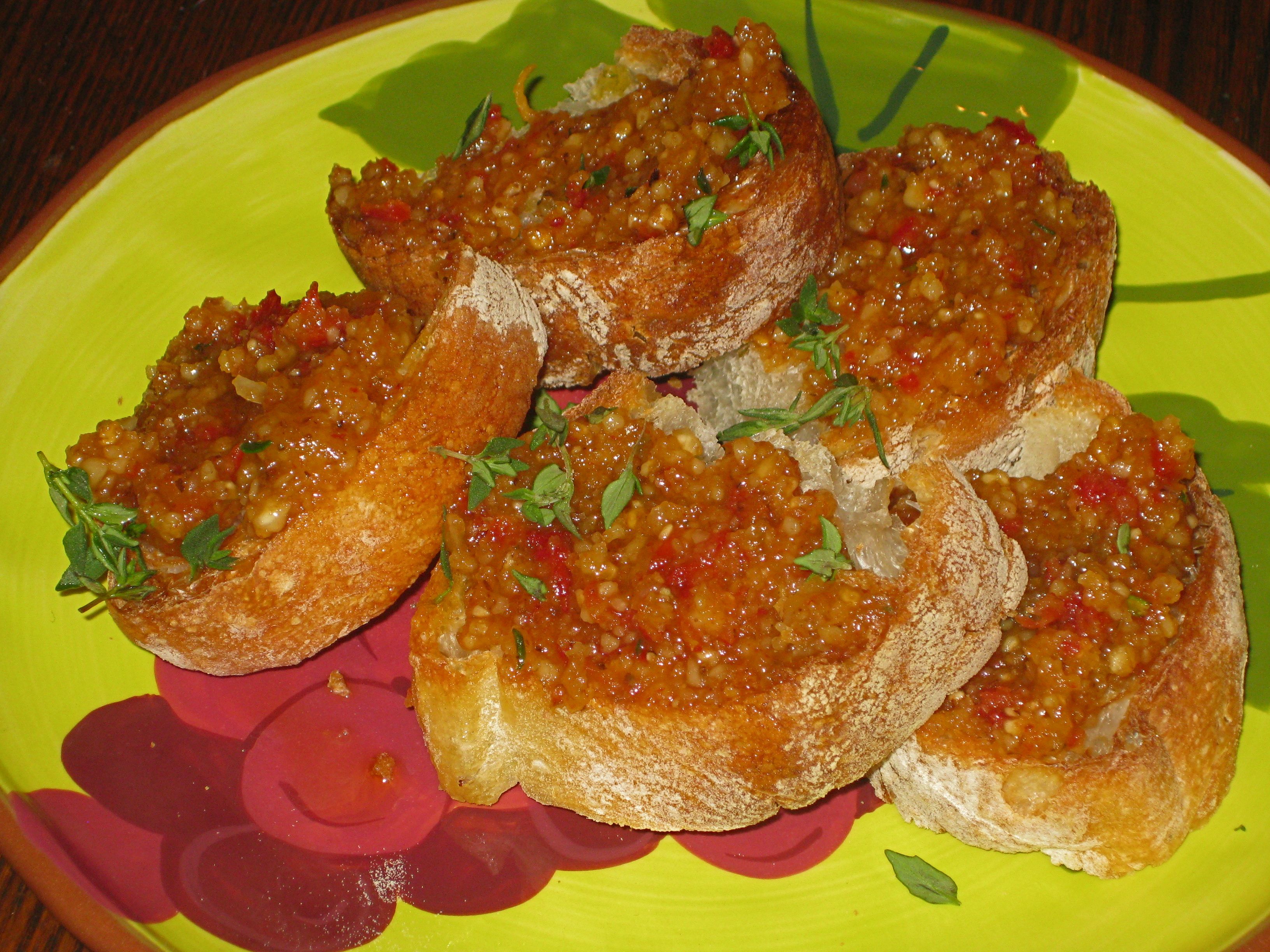 This is her interpretation of the walnut pesto served on crostini at Gottino, a wine bar in the West Village in Manhattan that we both like very much. I did a little review of the place when it first opened a couple of years back. The pesto at Gottino, as I recall it, was basically walnuts, a bit of garlic, olive oil, and Parmigiano. Cindy says they also throw in a few sun-dried tomatoes (not sure how I missed that). I make a very simple version, often using instead of the parmigiano a few anchovies. This is great for pasta and spread on crostini, as they do it at Gottino.