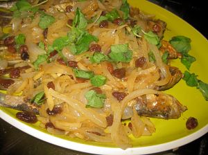 Agrodolce, sweet and sour, mostly means very old, pre-tomato dishes down there. Caponata, made with eggplant, is the one the most people are familiar with. When you make agrodolce with sardines, you sauté a copious amount of onion until sweet and melting. Then you mix it with raisins, pine nuts, wine, a splash of vinegar, fresh herbs, a little honey or sugar, and sometimes capers, too. You pour this rich sauce over the just-fried little fish and then, traditionally, leave it all to marinate for about a day before serving it at room temperature. Marinating makes the dish pungent, the vinegar and the sardines coming to the forefront. I like this intense version. It’s great for an antipasto offering along with maybe a glass of Falanghina, a nice, fresh white from Campania that I’m liking a lot lately. But I’ve come to prefer eating the fish hot, right after cooking, so there’s a more unified balance of sweet and sour, the fish gentle and the onion rather pronounced.