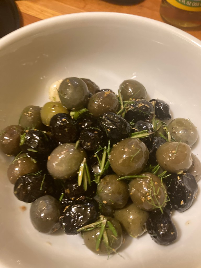 So all you really need to do here is buy good olives. I used cerignolo green and Moroccan black. A nice mix, I think. Then I sprinkled the olives with fresh chopped rosemary, fennel pollen (or fennel seed), a few crushed garlic cloves (make sure they’re fresh), and coarse ground black pepper. I also added the chopped fronds from a fennel bulb. If you don’t have this, you can use parsley or a little chervil or even a bit of tarragon, but not too much.