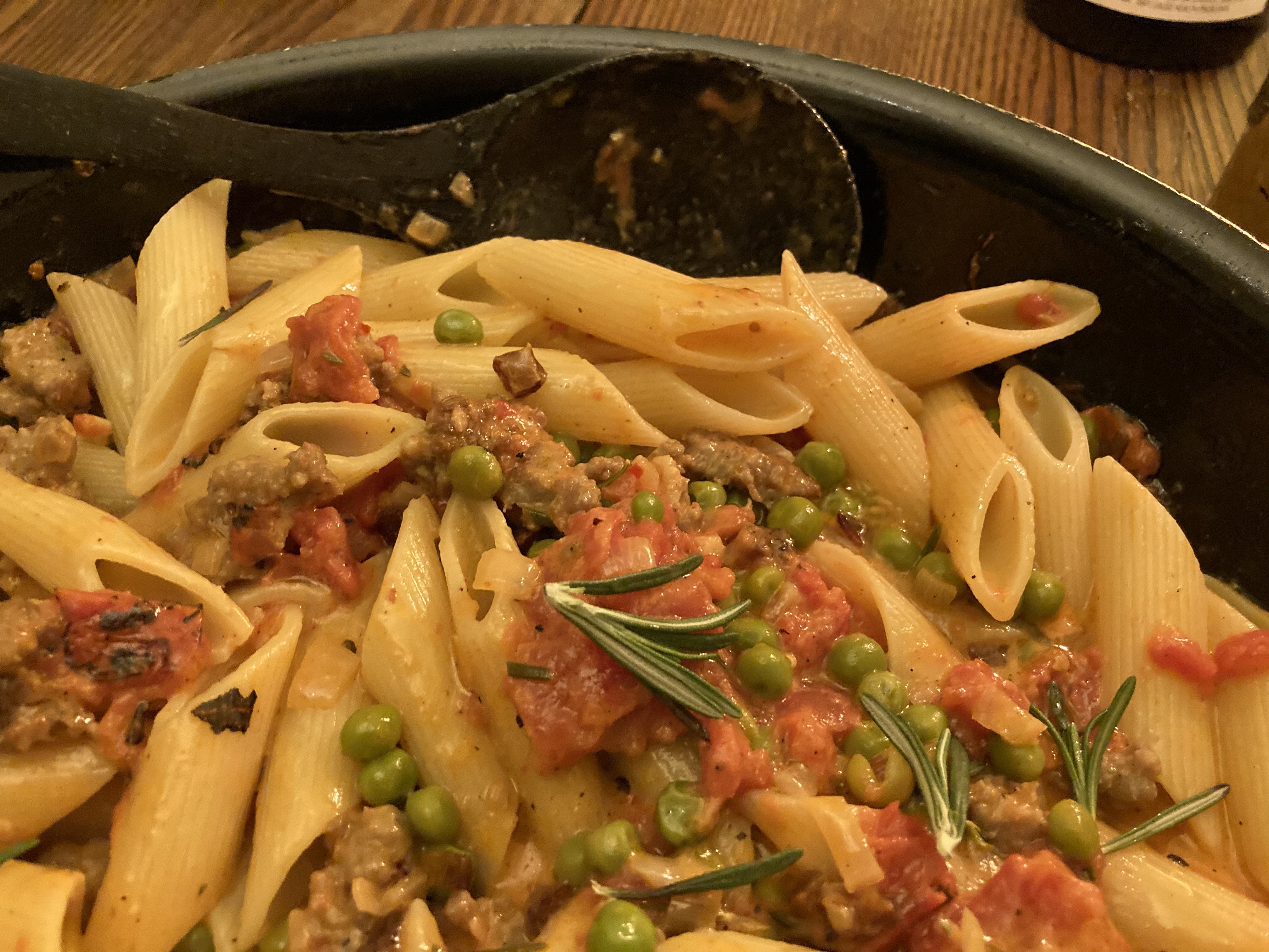 Their menu hasn’t changed at all since I first started going there almost 30 years ago, aside from a few seasonal dishes like puntarella and anchovy salad in the winter or the thick slices of local tomatoes drizzled with olive oil that show up in August. It is simple but thoughtful Italian cooking. Over the years I guess I’ve pretty much eaten my way through the menu, but I frequently return for the rigatoni Pitti, a solid bowl of al dente pasta studded with sausage and peas and bathed in a creamy tomato sauce. I’ve been thinking about how nice it would be to have that right now, at Bar Pitti, eating inside, all cozy with a bottle of Chianti and a few good friends. But of course that’s not possible. They do have outside heaters, but it’s freezing in Manhattan right now, and the heaters just don’t work well enough with the cold air whirling all around your feet and up to your face. So I decided to make rigatoni Pitti myself.