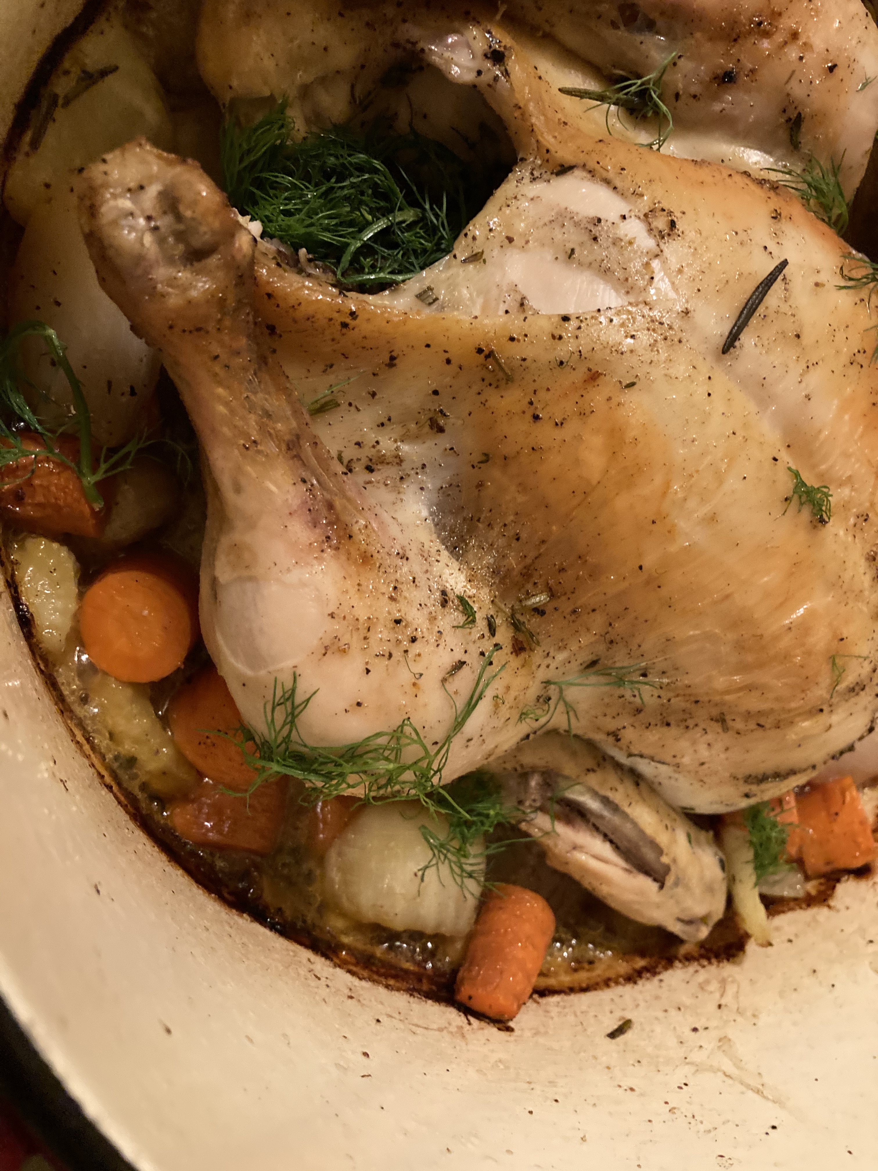 I cook whole chicken all the time. It seems natural, organic. I’m not sure where I originally got the idea for this all-in-one-pot approach. I thought it might have been from Julia Child, but I almost never use her recipes, and when I looked up chicken in a pot in one of her books, the instructions spanned three pages and entailed browning the thing in the pot, turning it on its sides, back, and breast, and then taking it out, and then adding vegetables, and then putting it back. It didn’t look familiar to me at all. My other thought was that I first read about it in Dorie Greenspan’s big book Around My French Table, which I don’t seem to have anymore, or maybe never owned but just borrowed at some point. In any case, it’s not a dish I learned from Mom. But I love it.