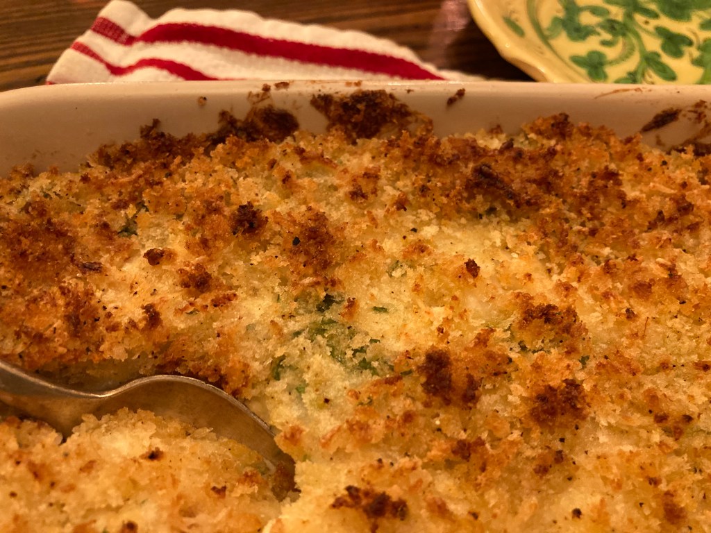 When you’re ready to serve it, preheat the oven to 425 degrees. Mix the panko with the grana Padano and a little olive oil. Sprinkle it evenly over the top of the baccalà, and stick the baccalà in the oven until it’s hot and bubbly and lightly browned, about 20 minutes.