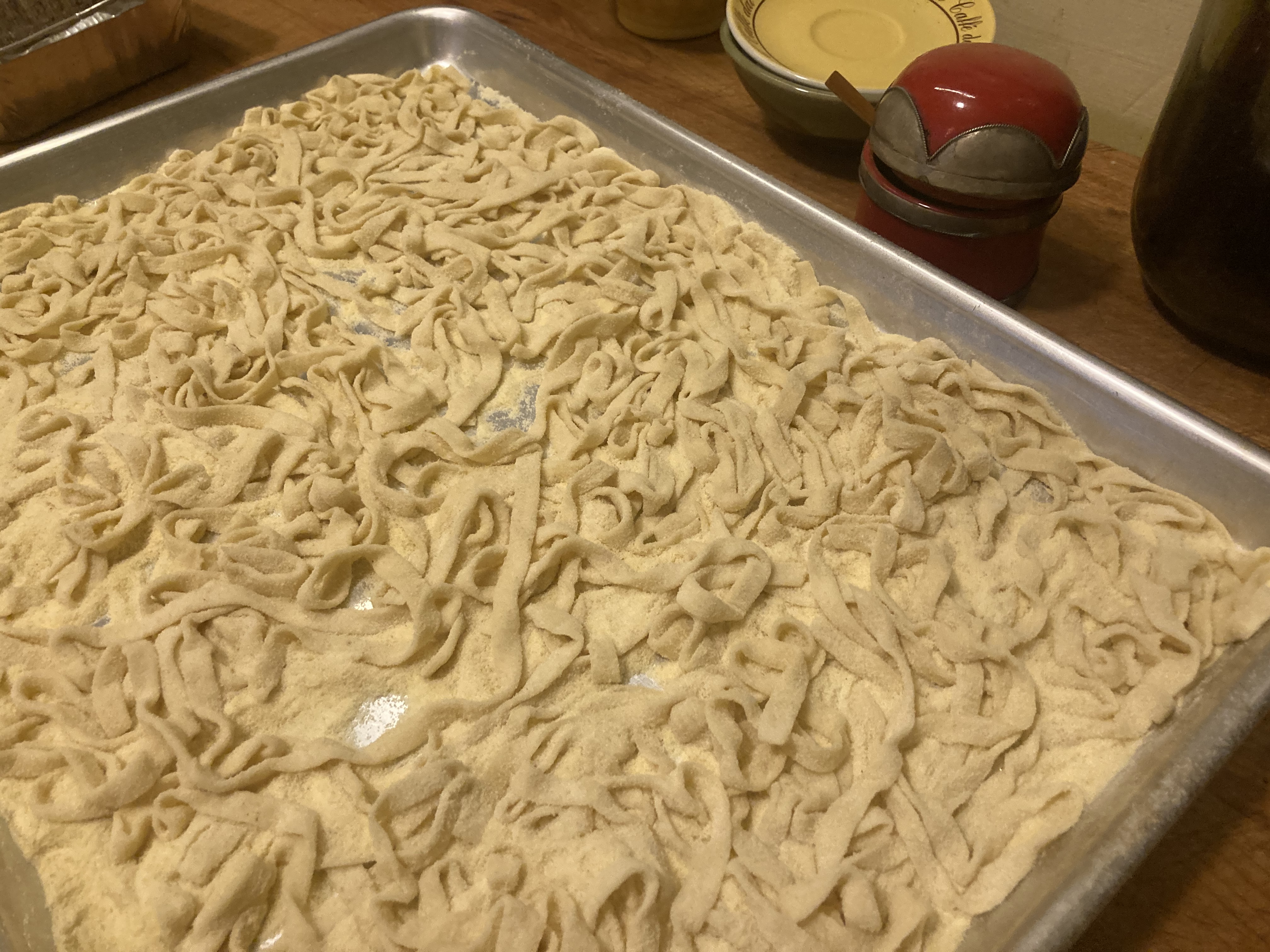 Get out 2 sheet pans, and dust them with semolina. Run the pasta sheets through your pasta machine on the tagliatelle setting. Place the tagliatelle on the sheet pans as they come out of the machine, sprinkling semolina over them to coat them well. You can arrange them in loose bundles. If you’ve got enough semolina on them, they won’t stick together. The pasta can sit this way for a few hours.