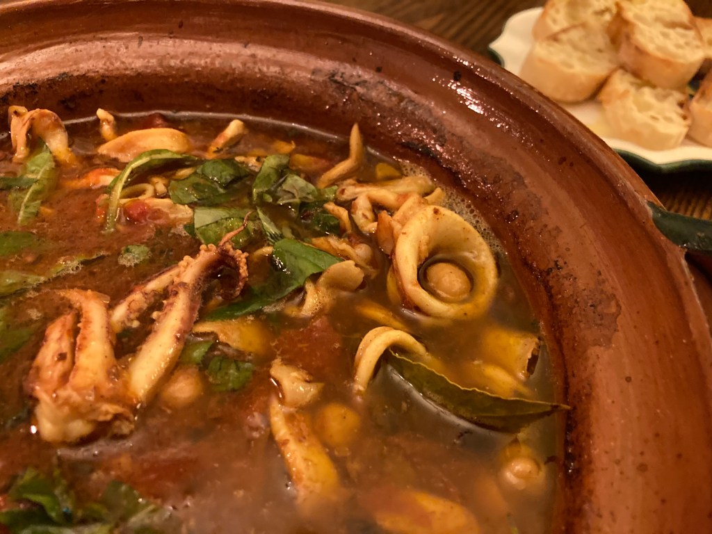 Note: If you’re not using a clay pot, simply add the squid and chickpeas to the sauté pan with the sauce, and simmer, covered, over low heat for about 45 minutes.