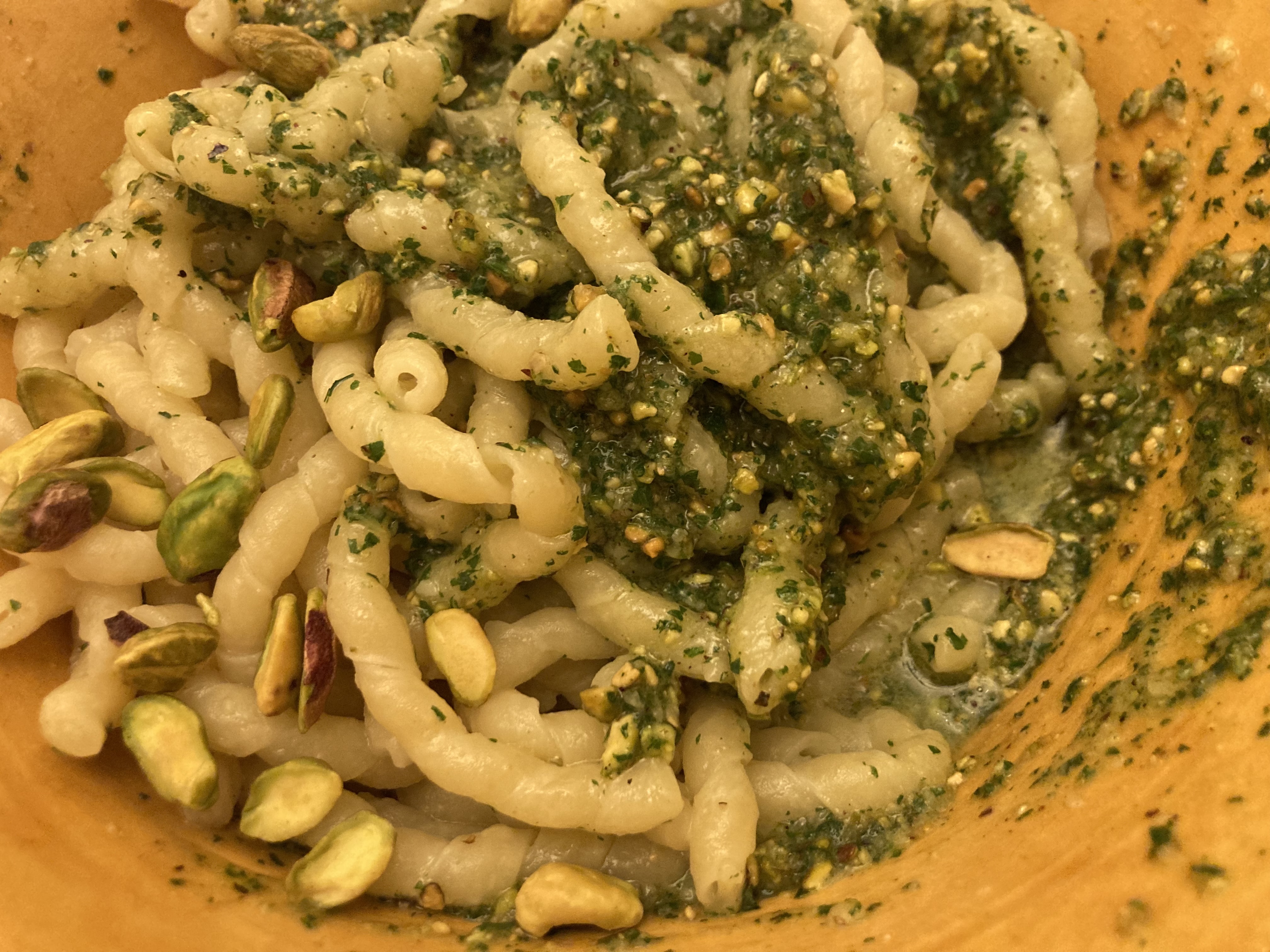 I tossed this rich, mellow pesto with a pound of busiate, a long, twisted traditional Sicilian pasta. Seemed like a really good match, considering that it involves most of the ingredients for a classic Trapanese pesto, excepting the tomatoes. You can use it as a condiment for seafood or vegetables (it’s excellent on roasted eggplant). And if you’re tossing it with pasta, remember to save a cup of the pasta cooking water to loosen it up and make it creamy.