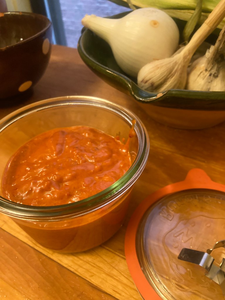 I roughly chopped and seeded my dozen espelettes. I then heated a little olive oil in a good-size sauté pan, dropping in the chilis and letting them sauté over medium heat for a few minutes, to start softening. I added a small, chopped summer onion and a big garlic clove, sliced, plus some salt, and let that sauté for a minute or so longer. Then I added about ½ teaspoon of allspice and a teaspoon of sugar, letting them warm through to release their flavors. I gave everything a splash of thyme vinegar (if you don’t have that, just add a few thyme sprigs when you add the allspice), and let it bubble for a few seconds. I threw in about a half a cup of warm water, turned the heat down a notch, covered the pan, and let everything simmer until the chilis were very soft, about another 8 minutes. Then I turned off the heat, added a drizzle of fresh olive oil, and let things cool off a bit before puréeing the result in a food processor. Taste it after you purée for a good balance of salt, sweet, and acid, adjusting as needed.