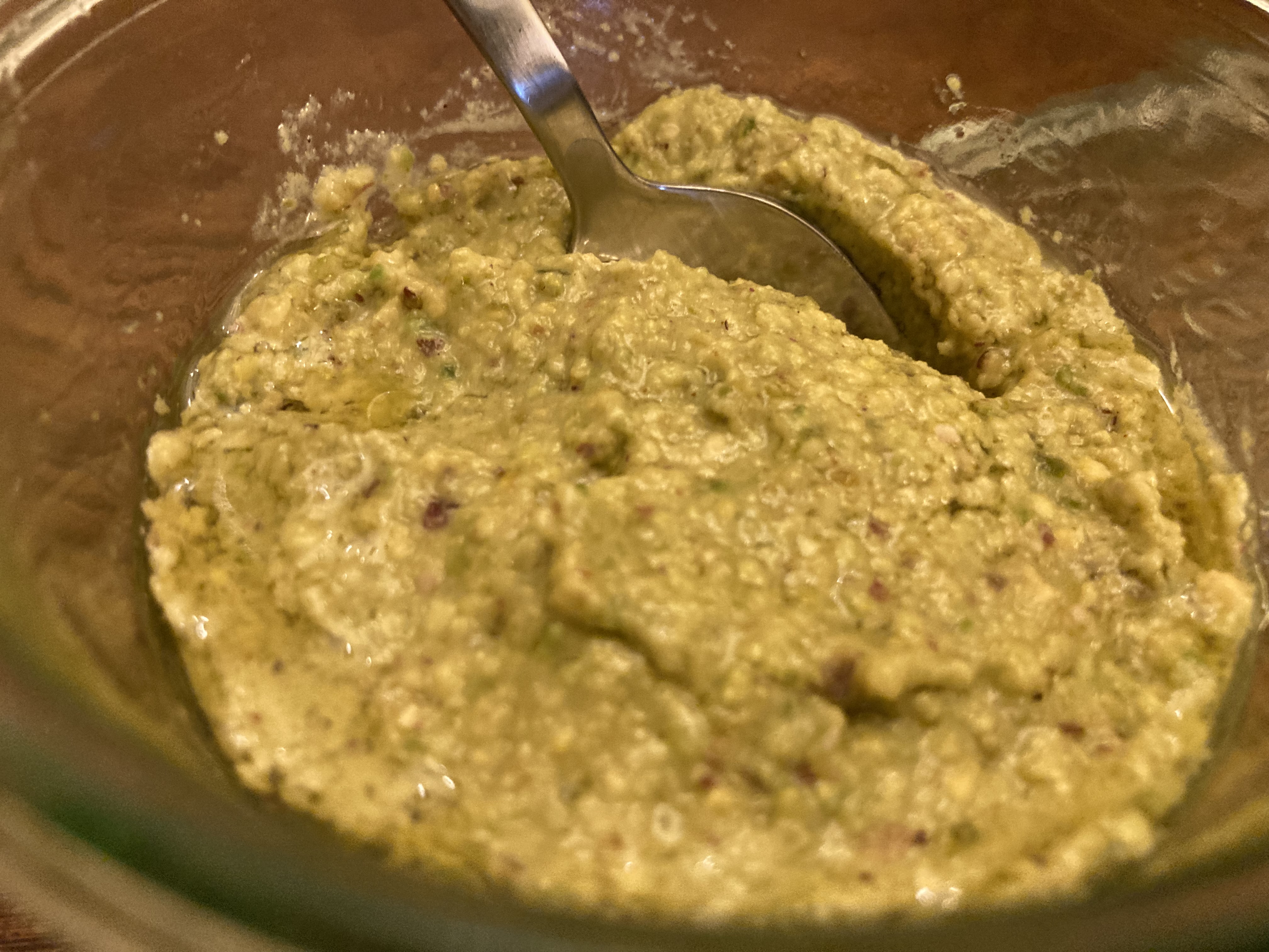 I’ve bought pistachio spreads at many Italian shops. The ones called pistachio cream tend to be sweet, more like something you’d layer in a cassata, but for a panino or to fold into a pasta sauce, for instance, you’d want a savory version, something more like a pistachio version of peanut butter. Sogno Toscano doesn’t seem to sell whatever they use on their panini. I did once order a good savory one made by Campo D’Oro, a Sicilian company that used real Bronte Sicilian pistachios. But those little jars are expensive, so I decided to try making some myself, and to my surprise it came out great. Nothing to it, really, except that you’ll want to start out with good pistachios.