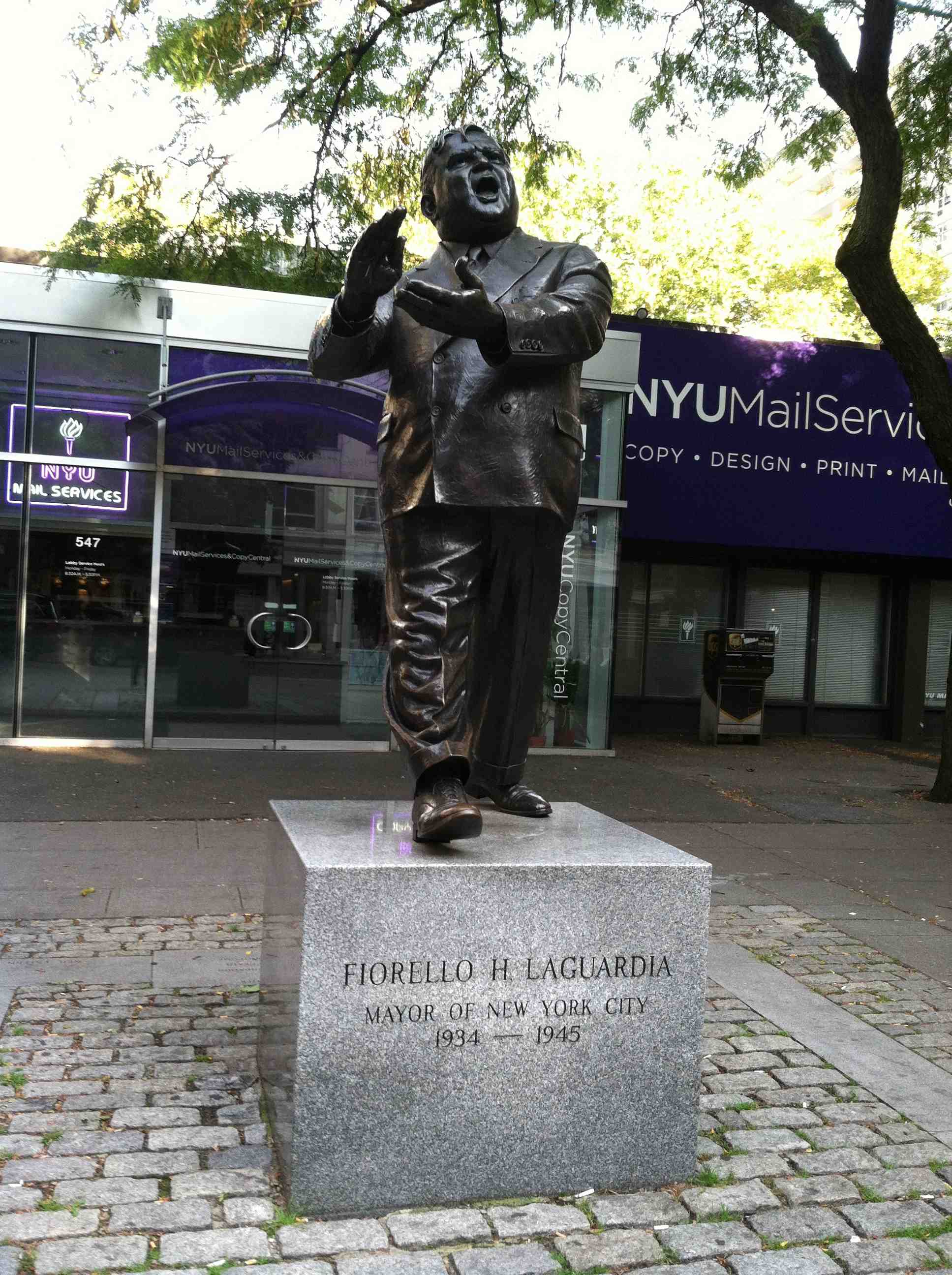 There’s a statue of Fiorello La Guardia, our ninety-ninth mayor, friend of FDR, foe of the Mafia, infrastructure king, on, fittingly, La Guardia Place. Since I’ve always lived in the Village, I’ve been walking past the statue seemingly forever, usually pausing, a little surprised by how short the legs are and how big the head is, deformed looking, actually. He was only five-two, but the statue, in my opinion, looks way out of proportion even for a short guy, and for that reason the thing has always stuck with me.