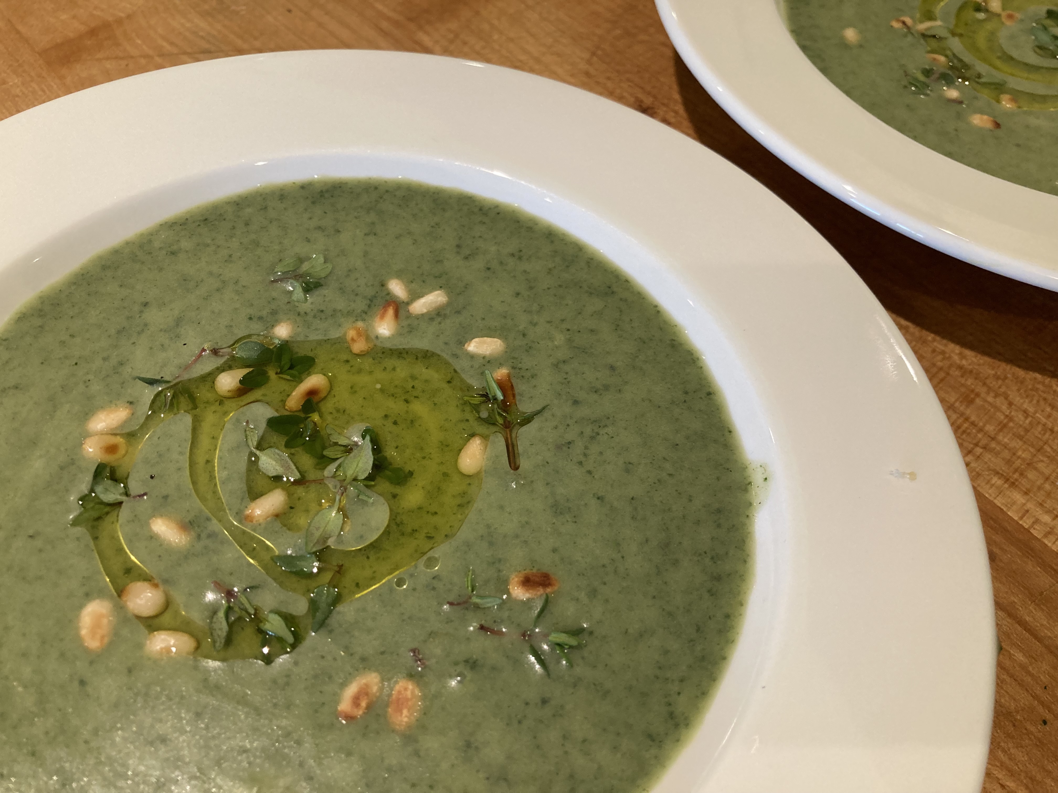 Recipe below, in text: Stinging Nettle Soup with Crème Fraîche, Thyme, and Pine Nuts