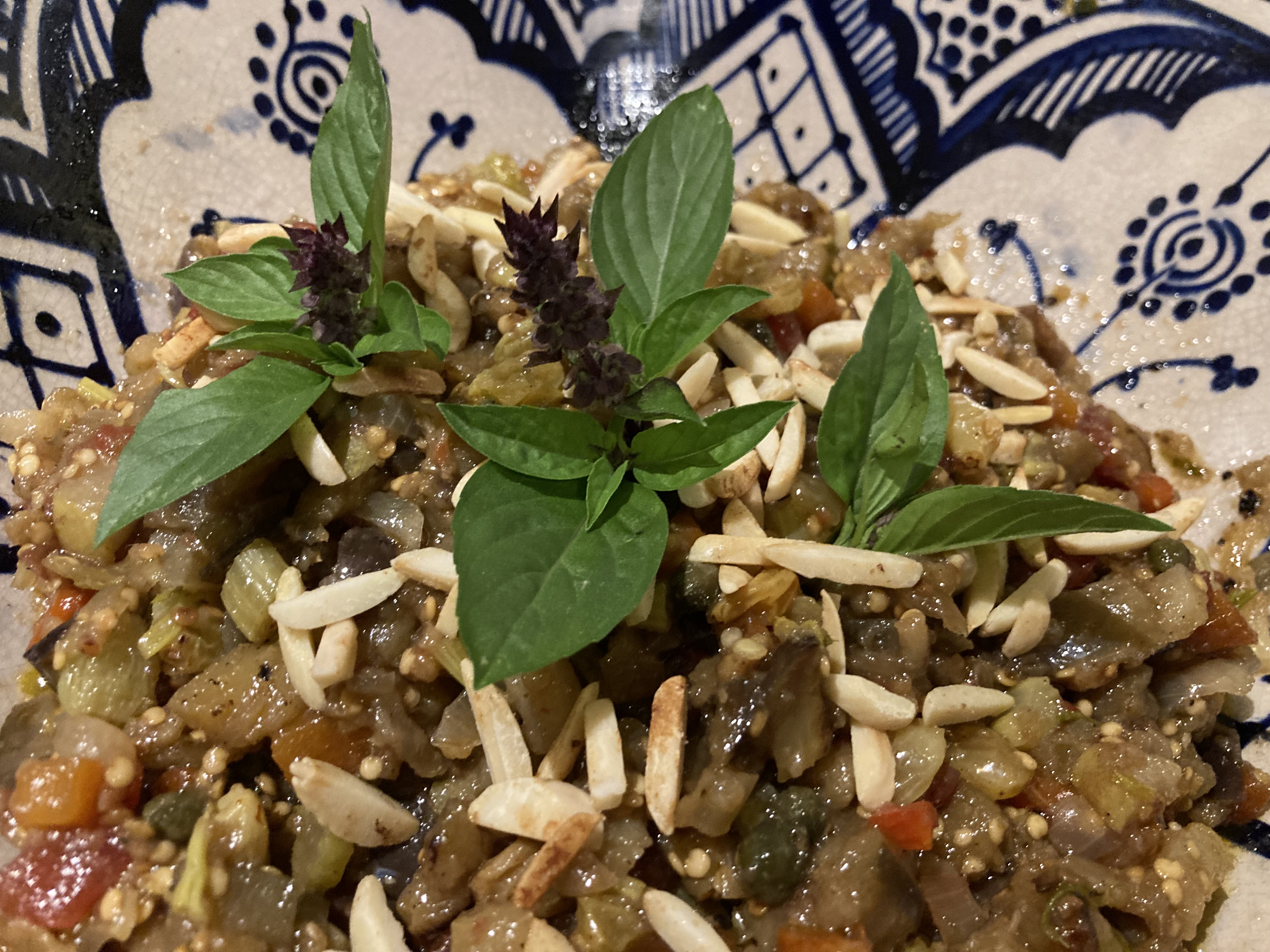 Recipe below: Caponata with Lovage, Thai Basil, and Pear
