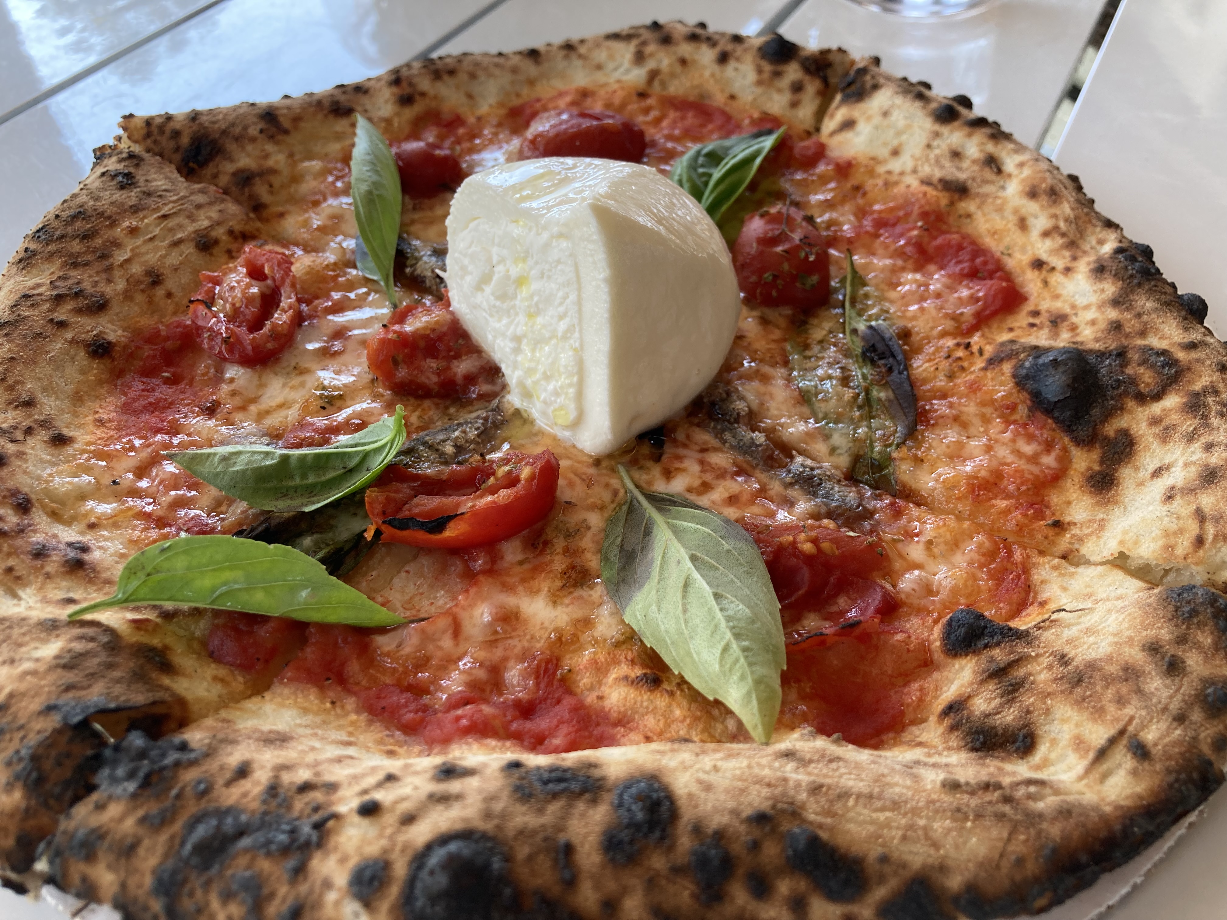 I could tell right away from the aroma wafting out from the Mommò truck that I was going to like its pizza. Mommò, I just learned, is Neapolitan for “right now,” and that’s about right. The pizza takes three minutes to cook. Luca, the owner and pizzaiolo, is from Italy, and he has the Neapolitan flavor down. The crust is yeasty and pully and just a touch salty, with charred but not too charred bubbles circling its rim. That is the taste I want but often don’t get. He’s got wood, but unlike most of the pizza people who drag around a wood burning oven with their truck, Luca had it built right into his truck. It doesn’t seem possible, but I’ve seen it. He explained to me that it’s a stainless steel pizza oven made in Naples for backyard use. It’s a little tight, but he got it to fit. If he turns around without thinking, he can burn his arm. But he’s been doing this for almost three years now, and I guess he’s got the reflex down.
