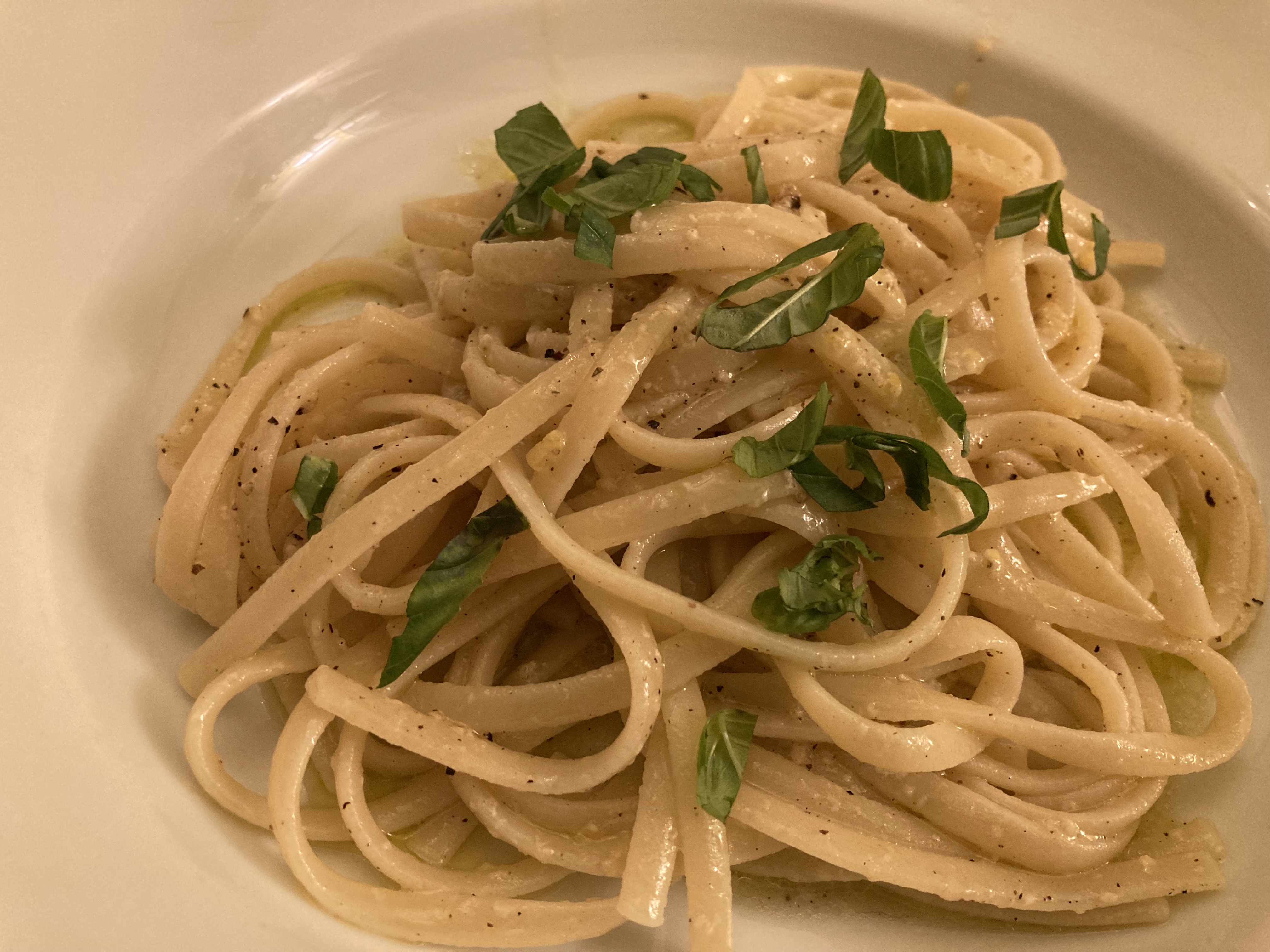 Drain the linguine, and add it to the bowl, tossing it well until it’s well coated with the sauce. You can garnish it with more basil or an additional dusting of Parmigiano, if you like.