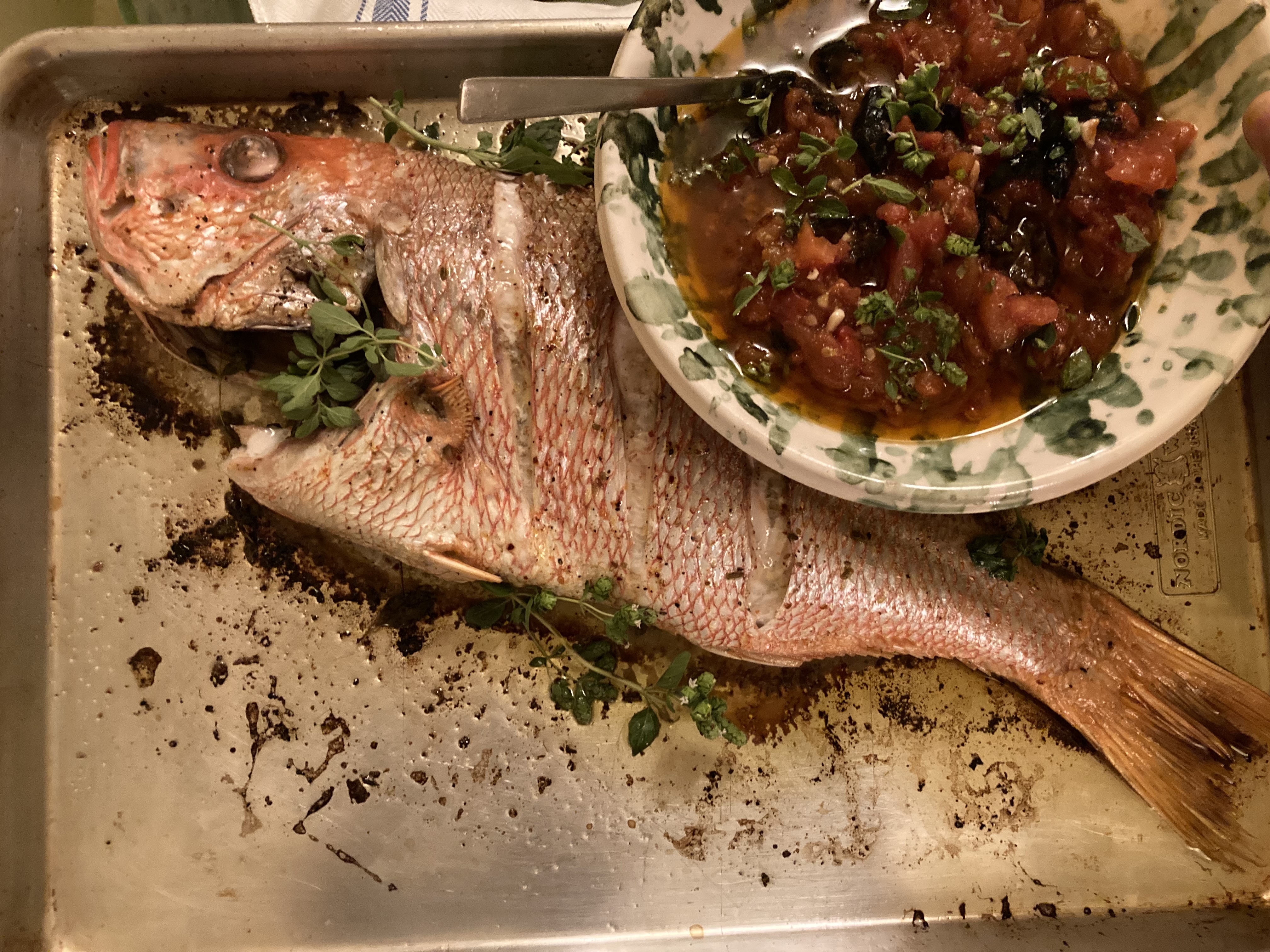 This time around I made a vibrant vinaigrette with lemon, good olive oil, and fennel seeds, and rubbed it all over the fish, inside and out, and then stuffed the inside with Italian oregano. That’s a favorite oregano of mine, not too harsh like the Greek variety. It’s actually a cross between Greek oregano and marjoram, so it’s more floral and less biting. It’s good for a mild fish like red snapper.