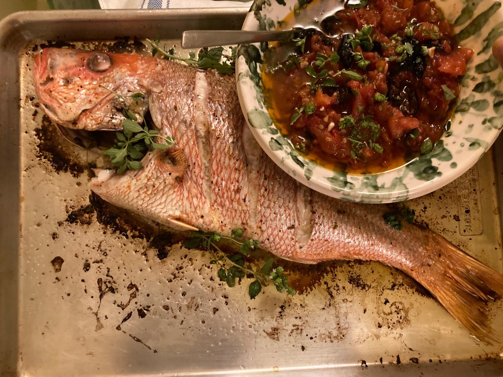 Roasted Red Snapper with Tomatoes, Cumin, Moroccan Olives, and Italian Oregano