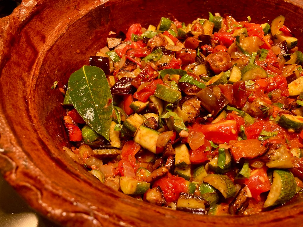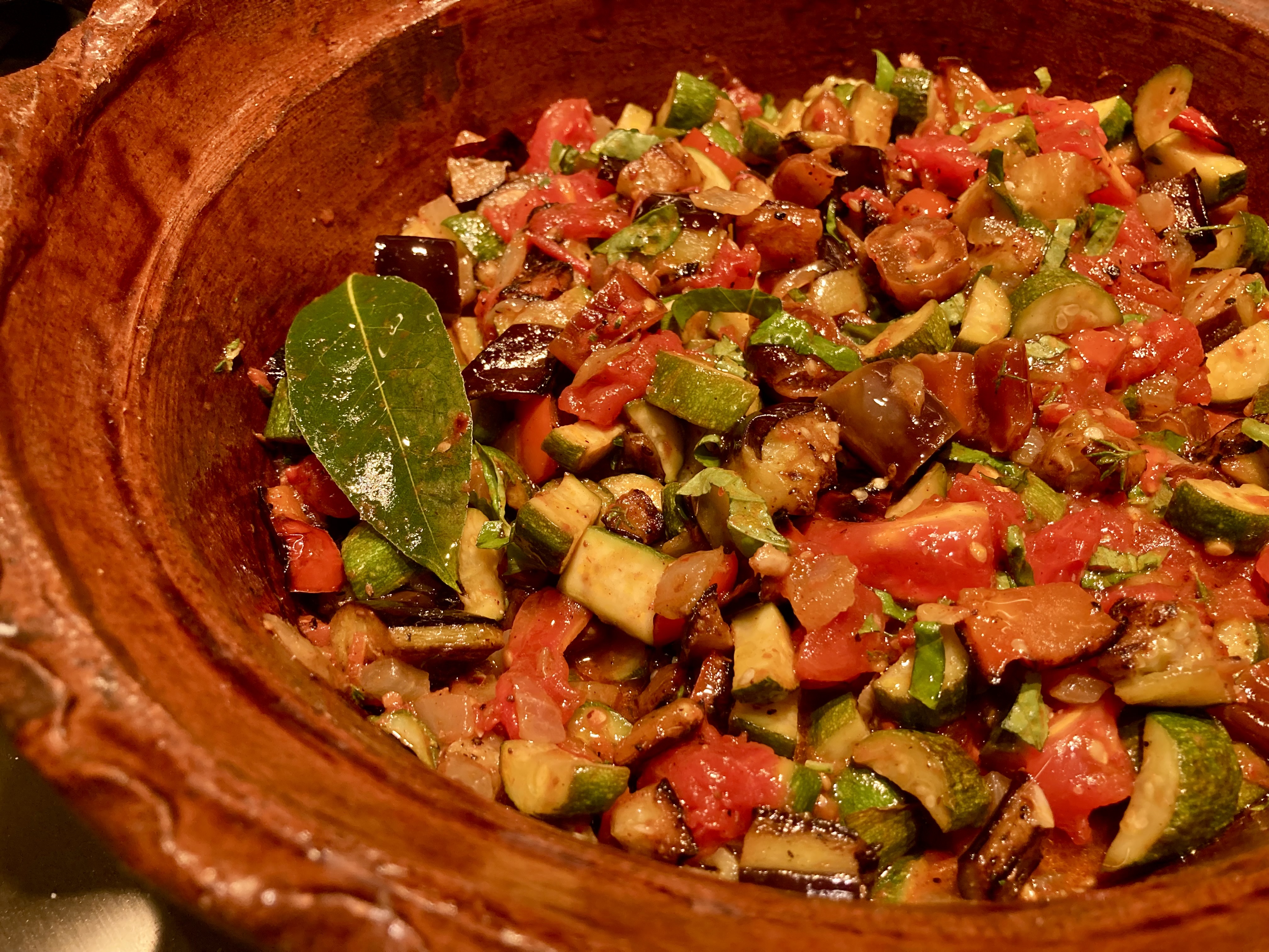 Ciambotta is Southern Italy’s version of ratatouille. It was a late summer ritual in my family, often using vegetables from my father’s backyard garden. Now it’s my responsibility to carry that on. Ciambotta translates to something like a big mixup or a mess, and the word is often used when someone has created a big emotional mess in their life, as in, “Richie made a real jambot outta his marriage.” (That’s how my family, and most Southern Italian Americans, pronounce the word.) The dish almost always contains the summer quartet of eggplant, sweet pepper, zucchini, and tomato, just like ratatouille, but the Italian version tends to be more freewheeling. Often potatoes or celery, and sometimes chunks of sausage or pancetta, are mixed in, making it a piatto unico, a one-course dish. One thing not to my knowledge ever added to it is dates. But this year they’ve made their way into my version, and I was very happy with how that turned out, the sweet dates playing again the bitterness of eggplant and the acidity of the tomatoes. A success.