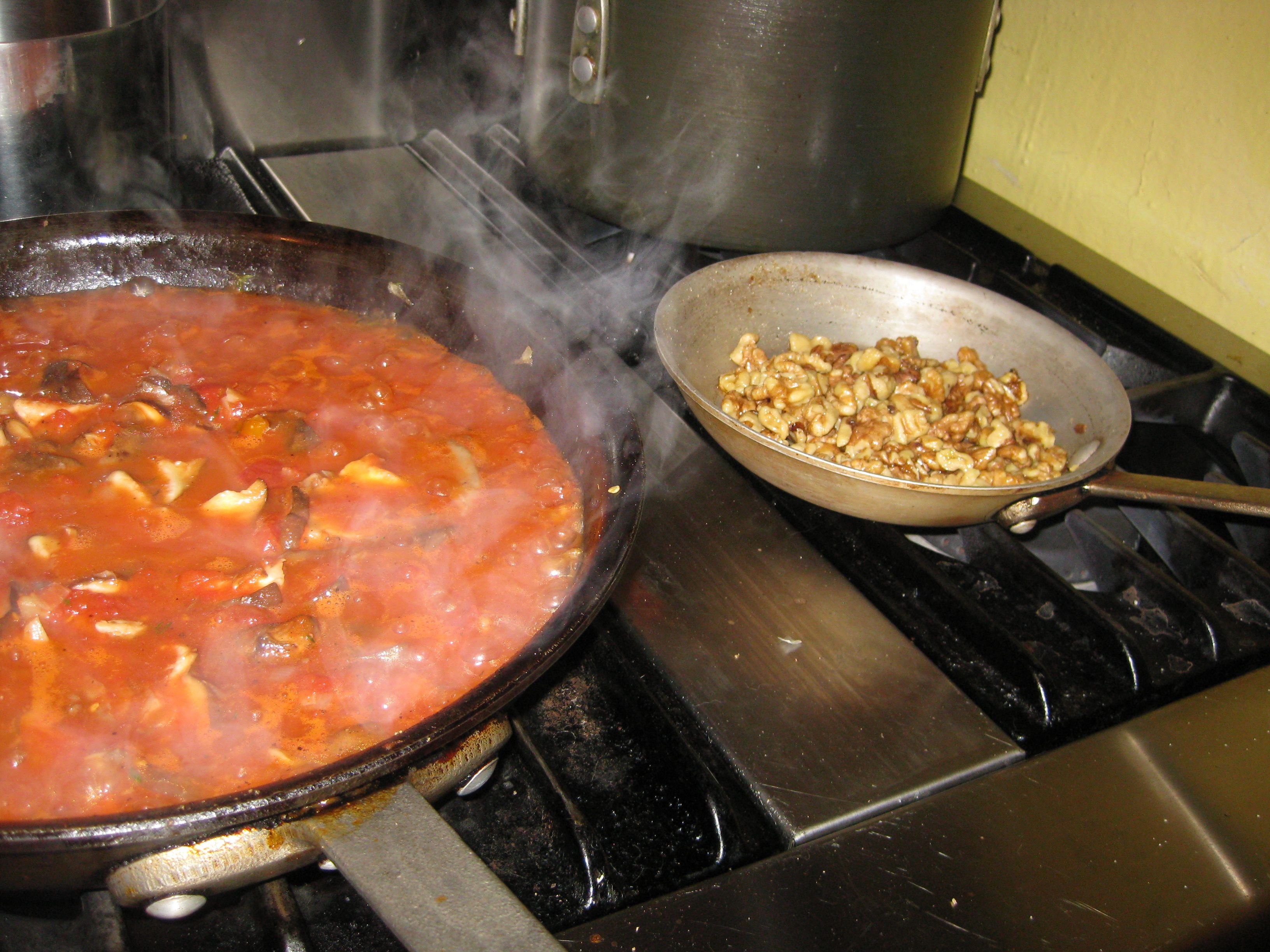 As you know, I’m usually a purist and quite the snot about only using top-notch Italian ingredients, so you might wonder why I stooped so low as to use instant polenta for this dish. First off, I was in a hurry to get it put together and carried out of here, but most important, I found a brand of instant that I liked. Moretti, I just discovered, makes a very good precooked polenta, called Polenta Lampo. It’s got very rich corn flavor. I’ve always used their regular polenta and loved it, so I thought I’d give this one a try. Very decent for a shortcut. You can find it at www.buonitalia.com. Also, when I’m layering polenta into a baked dish I find the quick-cooking kind easier to work with. It doesn’t seem to seize up as fast as the real stuff, so I can pour it out onto sheet pans without its solidifying into a lump before it’s half way out of the pot. I did make sure I stayed on the up and up in the cheese department. I purchased the best Fontina Valle d’Aosta and parmigiano Reggiano I could find.