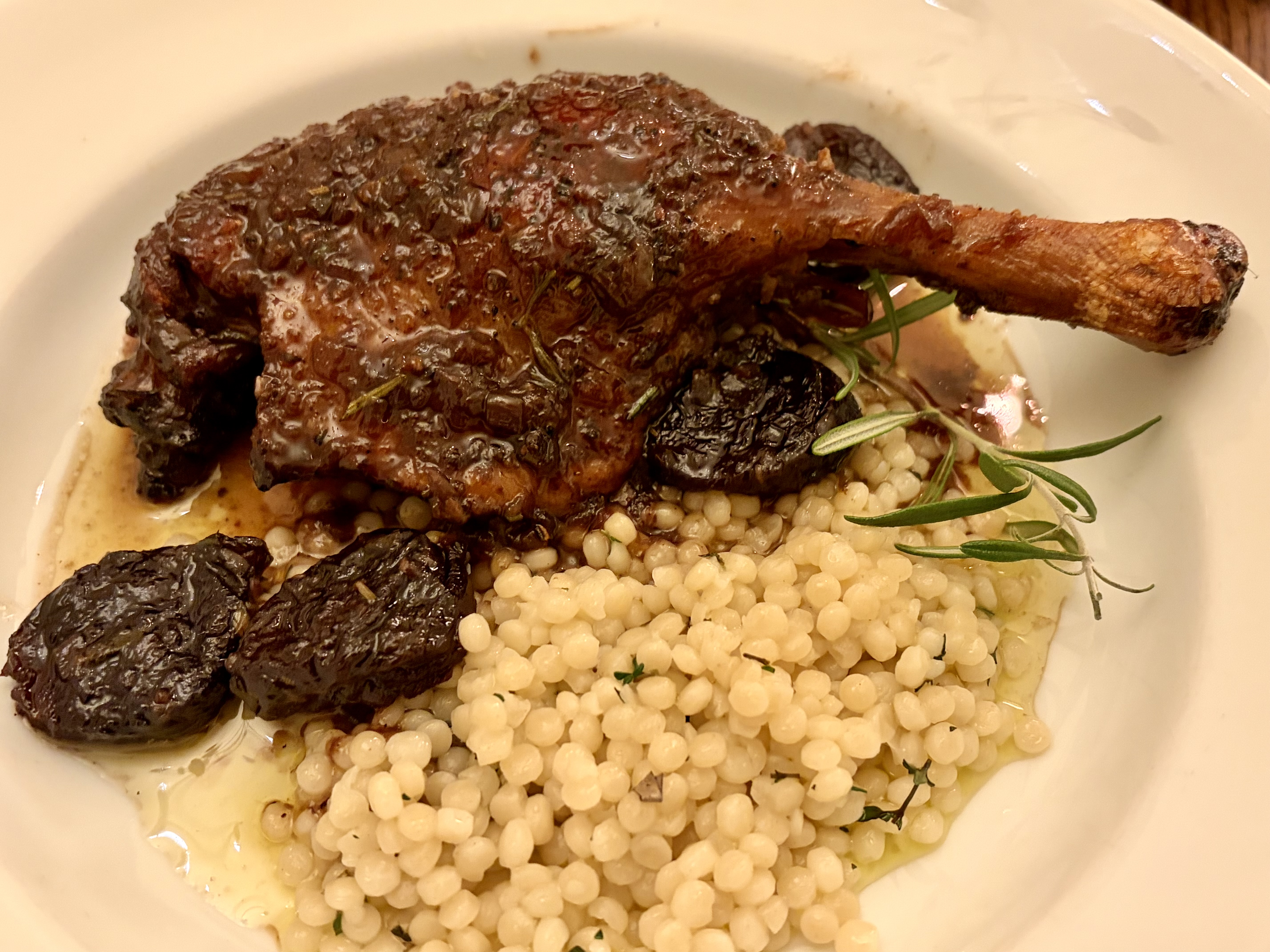 Put the duck back in the pan, skin side up. Add enough chicken broth to come up a little more than halfway, to just under the edge of the skin. Sprinkle the rest of the rosemary over the duck. Bring the liquid to a gentle boil, and then stick the pan in the oven and braise it there uncovered (which will help keep the skin crisp), for about 2 hours. Add the prunes after 1½ hours. Check once in a while to make sure the liquid isn’t getting too low, and add a little more broth or even water if needed. I didn’t have this problem, but you never know.